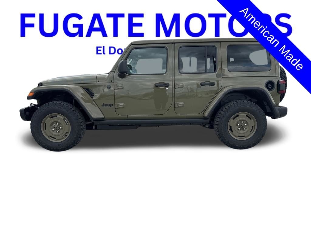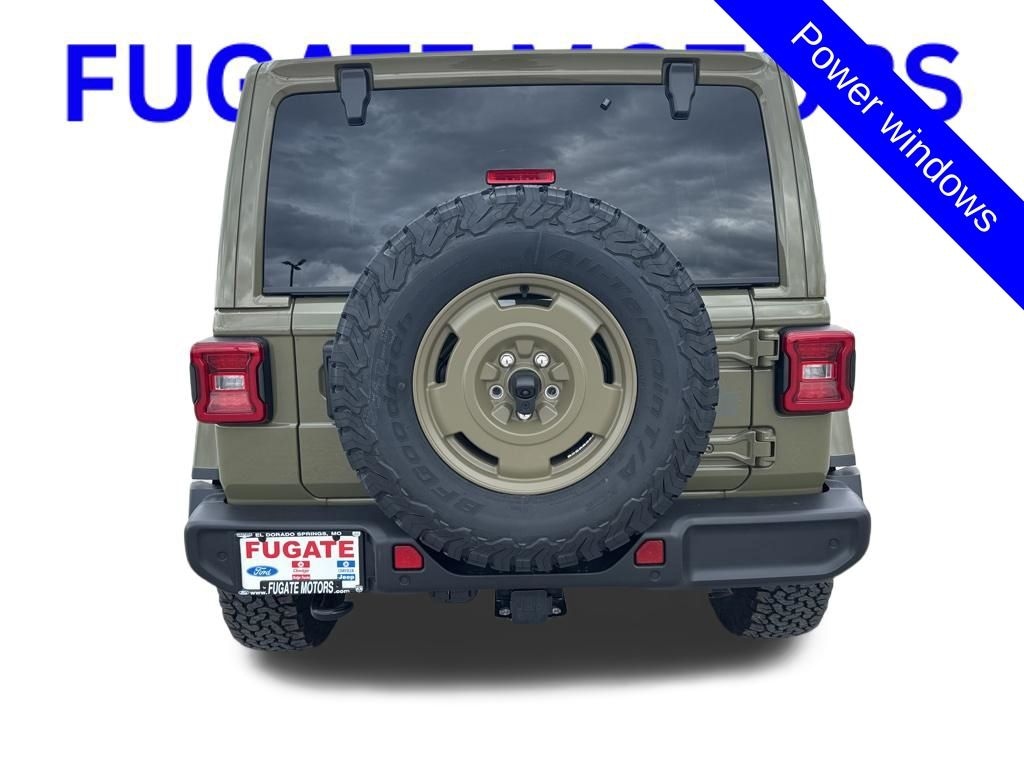 Convenience Group (Universal Garage Door Opener, 2-Door Passive Entry, Front Door Locks, Air Conditioning with Auto Temp Control, Air Filtering, Cluster 7.0" TFT Color Display, Emergency/Assistance Call, Heated Front Seats, and Heated Steering Wheel), Quick Order Package 24H Willys 41 (Adaptive Cruise Control with Stop, Automatic Headlamps, Corning Gorilla Glass, Off-Road Plus Mode, Willy's Suspension, 4WD Willys '41 Swing Gate Decal, 7 and 4 Pin Wiring Harness, 97 MPH Vehicle Max Speed Calibration, Advanced Brake Assist, Auxiliary Switches, Body Color Grille with Gloss Black Rings, Body Color Rubicon Highline Flare, Class II Receiver Hitch, Cloth Low-Back Bucket Seats, Conventional Differential Front Axle, Dana M210 Wide HD Tube Front Axle, Dana M220 Wide Rear Axle, Daytime Running Lamps LED Accents, Deep Tint Sunscreen Windows, E-Locker Rear Axle, Front LED Fog Lamps, Full Speed Forward Collision Warning Plus, LED Premium Reflector Headlamps, MOPAR All-Weather Floor Mats, Power Heated Mirrors, Premium Tan Sunrider Soft Top, Premium Wrapped Steering Wheel, Security Alarm, Steel Front Bumper, Steel Rear Bumper, Sun Visors with Illuminated Vanity Mirrors, Wheels: 17" x 7.5" Fully Painted, Willys '41 Retro Edition Buzz Model, Willys '41 Retro Edition Hood Decal, Willys '41 Retro Edition Tailgate Plaque, Willys '41 Retro Edition Wrangler Decal, Willys '41 Retro Shift Bezel Insert, and Willys '41 US Edition U.S. Hood Decal), Safety Group (Auto High Beam Headlamp Control, LED Taillamps, Blind Spot and Cross Path Detection, Injection Molded Black Rear Bumper, and ParkSense Rear Park Assist System), Steel Power Dome Hood Package (Power Dome Dual Vented Hood), 12.3" Touchscreen Display, Delay-off headlights, Front fog lights, Power windows, 4-Wheel Disc Brakes, 4G LTE Wi-Fi Hot Spot, 8 Speakers, ABS brakes, Air Conditioning, AM/FM radio: SiriusXM with 360L, Apple CarPlay, Apple CarPlay/Android Auto, Aux Battery, Body Color 3-Piece Hard Top, Brake assist, Compass, Connectivity - US/Canada, Driver door bin, Driver vanity mirror, Dual front impact airbags, Dual front side impact airbags, Electronic Stability Control, For More Info, Call 800-643-2112, Freedom Panel Storage Bag, Front anti-roll bar, Front Bucket Seats, Front Center Armrest w/Storage, Front reading lights, Google Android Auto, Illuminated entry, Integrated Center Stack Radio, Integrated roll-over protection, Low tire pressure warning, Manufacture Statement of Origin, Myflexcare Service Plan, No Soft Top, Non-Lock Fuel Cap Without Discriminator, Normal Duty Suspension, Occupant sensing airbag, Outside temperature display, Overhead airbag, Panic alarm, ParkView Rear Back-Up Camera, Passenger door bin, Passenger vanity mirror, Power steering, Radio data system, Radio: Uconnect 5 with 12.3" Display, Rear anti-roll bar, Rear reading lights, Rear Window Defroster, Rear Window Wiper/Washer, Remote keyless entry, SiriusXM Radio Service, SiriusXM with 360L, Speed control, Split folding rear seat, Steering wheel mounted audio controls, Stop-Start Dual Battery System, Tachometer, Telescoping steering wheel, Tilt steering wheel, Traction control, Trip computer, Variably intermittent wipers, and Wheels: 17" x 7.5" Black Steel Styled.